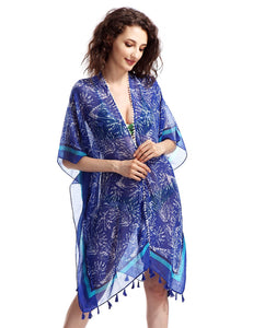 Avoir Aime Long Abstract Patterned Lightweight Kimono Wrap with Fringe Ball Trim