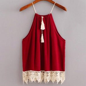 2017 New Arrival Fashion Women Lace Trimmed Tasselled Drawstring Blouse Wine Red Tops shirt Sleeveless Patchwork blusa feminina