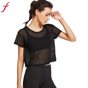 2017 Fashion Fitness T shirt Women Black Mesh Cover Up Sporting Meshed Top Dancing Shirt Harajuku Tee Tops