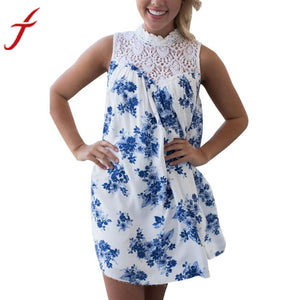 2017 Beachwear Summer Dress Women Sleeveless Blue Floral Printed Lace Splice Casual Beach Evening Sundress vestido de festa